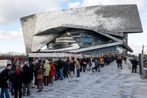 En sautant du Tram, je découvre la foule des grands jours à la Philarmonie porte de Pantin. Alors que l'architecture spectaculaire de la toiture en alu reflete les rayonss du soleil couchant, je pénètre dans le nouveau temple de la musique parisienne dans une cohue assez rock'n'roll ! Le Mythe est à Paris et la perspective de découvrir l'exposition qui a défrayé la chronique londonienne électrise les invités de ce vernissage événement.